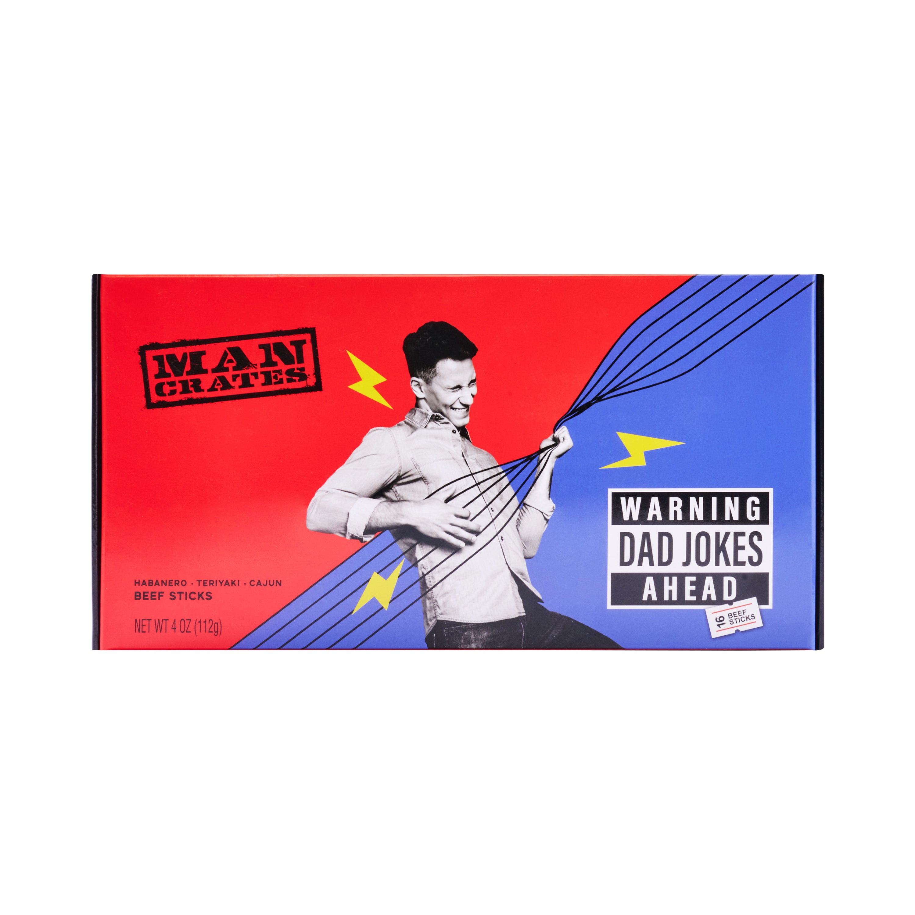 Includes 6 Teriyaki beef sticks, 5 Cajun beef sticks, and 5 Habanero beef sticks all wrapped up in epic dad jokes.